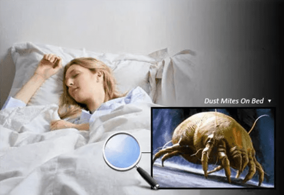 Mite droppings mix with dust and spread through the air, triggering allergic reactions when inhaled, affecting the eyes, nose, and lungs.